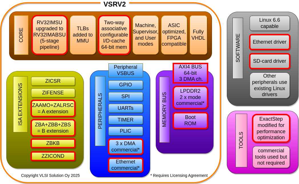 VSRV2 - 32-bit Linux-capable RISC-V CoreFeaturesThe VSRV2 is a second-generation 32-bit RISC-V CPU core that introduces several major enhancements over the VSRV1 baseline architecture (shown with the red color in the above Figure). One of the most significant changes is the increase in the AXI data bus width from 32 bits to 64 bits, which substantially improves memory bandwidth and overall system performance. VSRV2 also incorporates three identical Direct Memory Access channels to handle tasks such as SD-card operations and memory-to-memory copying, effectively reducing processor overhead compared to the VSRV1. Regarding the instruction set architecture, VSRV2 expands on the RV32IM base by adding support for atomic operations, bit manipulation, cryptography extensions, and conditional arithmetic operations. The cache system was also updated to accommodate the wider data path, resulting in a cache line size of 16 words per line in VSRV2 compared to 8 words in VSRV1. Finally, the system hierarchy was restructured to place the debug UART on the same level as the CPU core to simplify debugging and testing procedures. VSRV2 is licensed under permissive Solderpad Hardware License v2. VSRV2 has two internal memory configurations available: